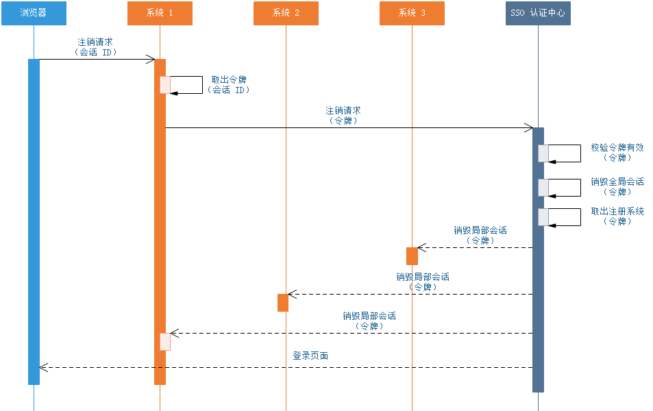 • 系统1根据用户与系统1建立的会话 id 拿到令牌,向 sso 认证中心发起注销请求