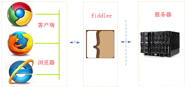 既然是代理,也就是说:客户端的所有请求都要先经过 Fiddler,然后转发到相应的服务器,反之,服务器端的所有响应,也都会先经过 Fiddler 然后发送到客户端,基于这个原因,Fiddler支持所有可以设置 http 代理为 127.0.0.1:8888 的浏览器和应用程序。使用了 Fiddler 之后,web 客户端和服务器的请求如下所示:
