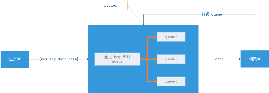这种的代表是 RabbitMQ(或者说是 AMQP)。生产者发送 key 和数据,消费者定义订阅的队列,Broker 收到数据之后会通过一定的逻辑计算出 key 对应的队列,然后把数据交给队列