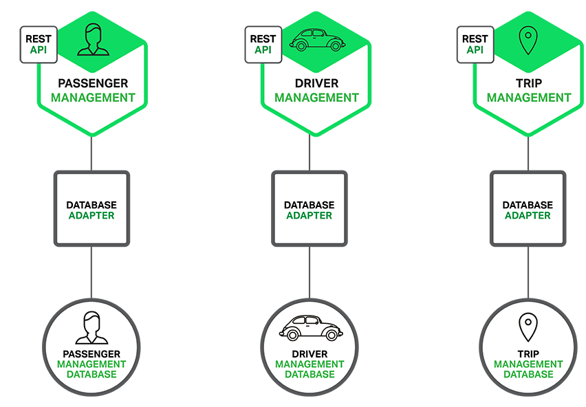 每个服务都拥有各自的数据库。而且,服务可以使用一种最适合其需求、号称多语言持久架构 (polyglot persistence architecture ) 的数据库。例如,DriverManagement,要找到与潜在乘客接近的司机,就必须使用支持高效地理查询的数据库。