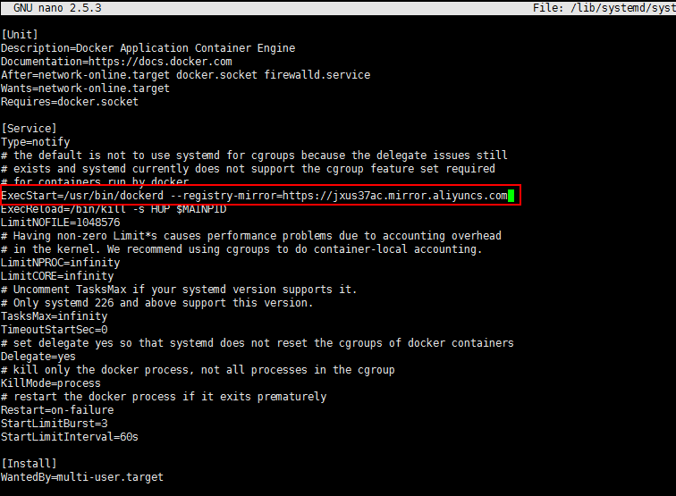 添加 --registry-mirror=https://jxus37ac.mirror.aliyuncs.com 到 ExecStart:
