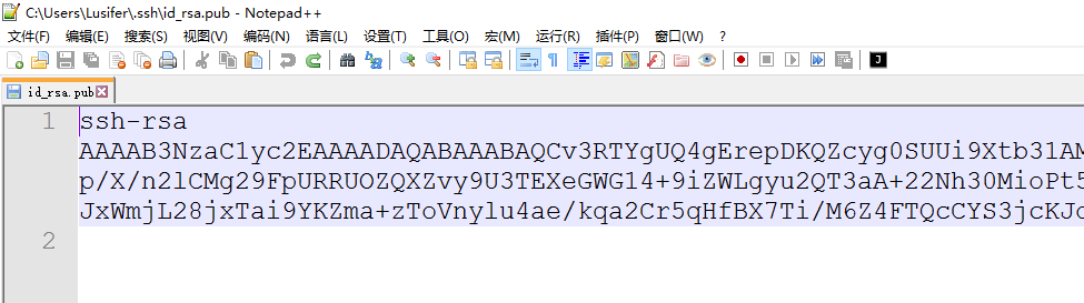 秘钥位置在:C:\Users\你的用户名\.ssh 目录下,找到 id_rsa.pub 并使用编辑器打开,如: