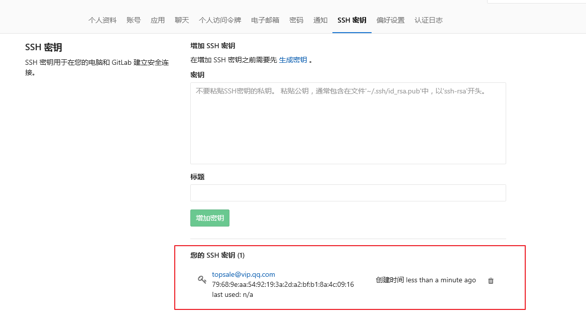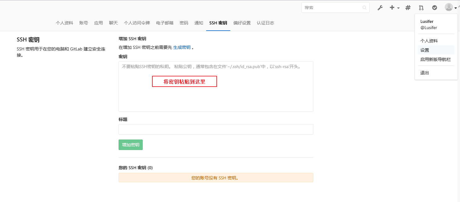 登录 GitLab,点击“用户头像”-->“设置”-->“SSH 密钥”