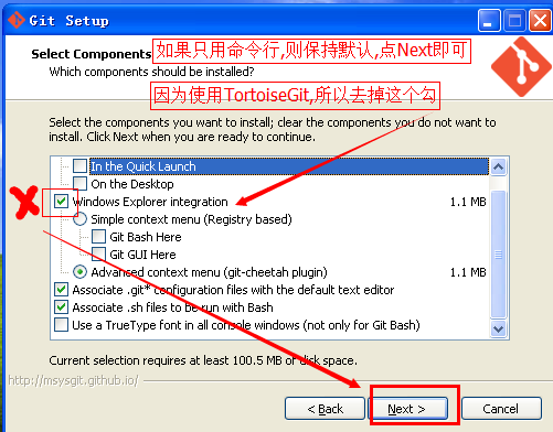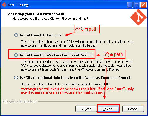 然后是是否配置Path的配置,选择中间一个,可以通过 Windows命令行(CMD)调用 git 命令。 然后点击下一步