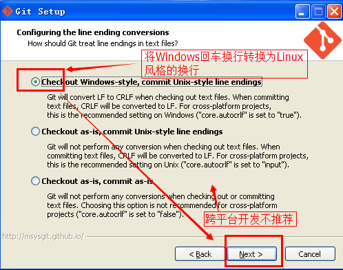 选择回车换行的格式。默认即可.(检出时转换为Windows风格,提交时转换为Linux风格.)