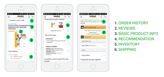 负载均衡器将请求路由到几个相同应用程序实例中的其中一个。之后,应用程序查询各个数据库表并返回响应给客户端。相比之下,当使用微服务架构时,产品详细页面上展示的数据来自多个微服务。以下是一些微服务,可能拥有给定产品页面展示的数据: